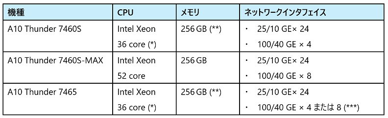 (***) A10 Thunder 7465で使用する100/40 GEポート数は、モジュラーライセンスにより変更可能