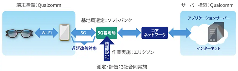 ユースケースとして、高いリアルタイム性が求められるXRコンテンツのストリーミング配信を、スマートグラスを活用して実施した。具体的には、スマートグラスをスマートフォンとWi-Fiで接続し、対象の5G基地局を介してスマートフォンを商用のモバイルネットワークに接続する構成で実施した。スマートグラスおよびスマートフォンは、インターネット上に構築したアプリケーションサーバーとの間でデータの送受信を行った。