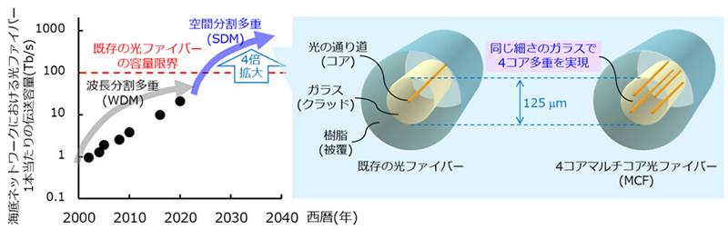 図1:既存光ファイバの容量限界を超える4コアマルチコア光ファイバ