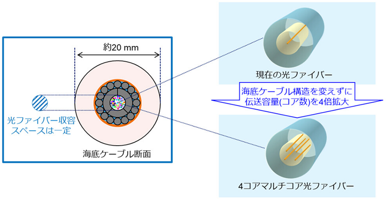 海底ケーブルの通信容量は、収容する光ファイバの心数を増やすことで拡大できる。しかし、収容スペースには制限があり、現在の収容心数は既に海底ケーブル上限の48心に達している。また、海底ケーブルは、水深8,000mの超高圧に耐える耐圧性、25年以上の長期運用を前提とした信頼性および敷設船等の設備インフラへの適合性をすべて満たすよう設計・製造されており、ケーブル径を太くすることで光ファイバの収容数を増やすことは困難だ。