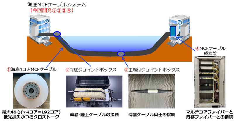 海底MCFケーブルシステムは、ネットワーク構築要素として、海底ケーブル本体に加え、海底–陸上ケーブルの接続や海底ケーブル同士の接続を行うジョイントボックス、ならびに通信局内で伝送装置と接続するための既存光ファイバとMCFを接続する成端架から構成される。これらの構築要素を商用利用可能な水準まで開発することで4コアMCFを適用した大容量な海底ネットワークの経済的な整備が実現できる。