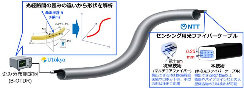 NTTと東京大学は3月19日、既存の光ファイバケーブル構造を活用したセンシング用光ファイバケーブルを用いて非常に緩やかな形状変化(数m以上の曲率半径)を検出できる光ファイバセンシング技術を世界で初めて実証したと発表した。