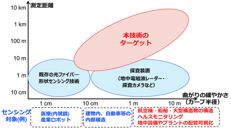 近年、光ファイバに沿った形状を検出する光ファイバ形状センシング技術が開発されている。この技術では、マルチコア光ファイバと呼ばれる、1本の光ファイバ内に複数の光の通り道を持つ構造を用い、それぞれの光経路に生じる違いから、光ファイバの曲がり具合や位置を推定する。この技術は、細い器具やロボットアームなど、形状の把握が重要な分野で有用なため、特に医療応用やロボティクスなどで活用されている。しかしながら、従来技術では、使用する測定器の制限などにより、検出できる長さは数m程度、検出可能な曲率半径も数cm以下に限られており、空間的な形状変化が非常に緩やかな大型構造物への適用は困難だった。一方、社会インフラや大型設備では、大型プラントのパイプラインや電力・通信・下水などの地下配管といった、直接観測が困難な構造物が多く存在する。これらの可視化には、カメラ搭載ロボットやレーダーなどが用いられているが、測定精度は環境条件の影響を受けやすく、構造物の長さ方向に沿った継続的な監視には課題があった。さらに、大型構造物では、時間の経過とともに生じるわずかな形状変化の蓄積が故障につながる可能性があるため、継続的な監視が重要だ。しかし、従来の技術では、構造物の全長にわたってこうした変化を常時モニタリングすることは困難だった。