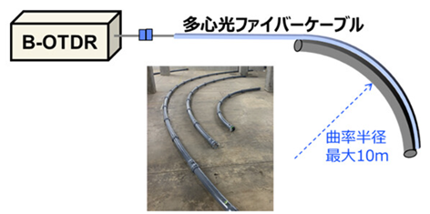 本実験ではNTT筑波研究開発センタ内に設置した曲率半径3~10mの3種類の模擬管路を用意し、光ファイバケーブルを管路に沿って固定して測定・解析を行った(図3)。光ファイバケーブル内に実装された複数の光ファイバに加わっている歪み分布をB-OTDRにより取得し、東京大学の村山英晶教授が開発した形状分布の逐次解析法を用いて、光ファイバケーブルの形状を推定した。