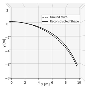 光ファイバ中の長手方向の歪みを分布的に測定できるB-OTDR(Brillouin-Optical Time Domain Reflectometry)を用いて、複数の光経路における歪みの違いから高精度な形状を推定する解析技術を開発した。複数の光経路で生じた歪みとそれらの位置関係から地点ごとの曲げ方向と曲がり量を推定し、それを長手方向に沿って逐次的に計算することで、光ファイバケーブル全体の形状を推定することができる。さらに、既知の曲げ形状あるいは直線状態における歪み分布を参照することで、形状推定精度の向上に成功した。また、従来の形状センシングで用いるOFDR(Optical Frequency Domain Reflectometry)方式は、測定距離が数m以下に制限されるが、B-OTDRを用いた計測手法では、数kmにわたる長距離の形状測定が可能になる。