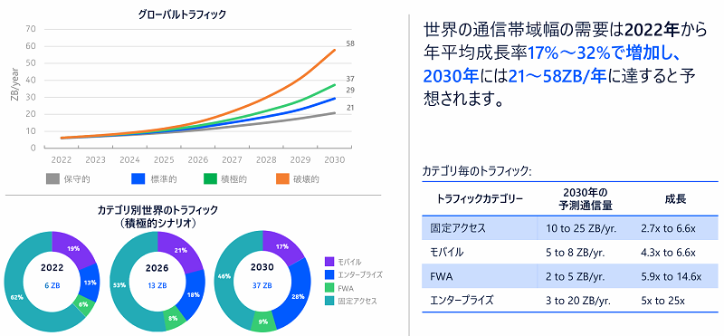 2030年までのトラフィック増加の予測では、特にエンタープライズの伸び率が高くなるとされている。これは、外部に出すことができない情報を扱う社内用のAI活用が増え、画像や表のデータが頻繁に行きかう社会が予測されているからだ。