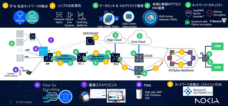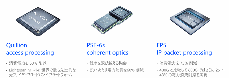 ノキアは戦略的にシリコンチップへ投資しており、アクセス系(PON)からIPまで、End-to-End で自社チップのポートフォリオを有している。アクセス系のQuillionは40%以上のシェアを持っており、100Gに向けて開発を進めている状況だ。IPのFPSも日本で高い評価を得ており、長年の実績が有る。こうした自社チップの技術がファイバ・フォー・エヴリシングを高度化し、ミッションクリティカルなネットワークの最適化に繋がっていく。