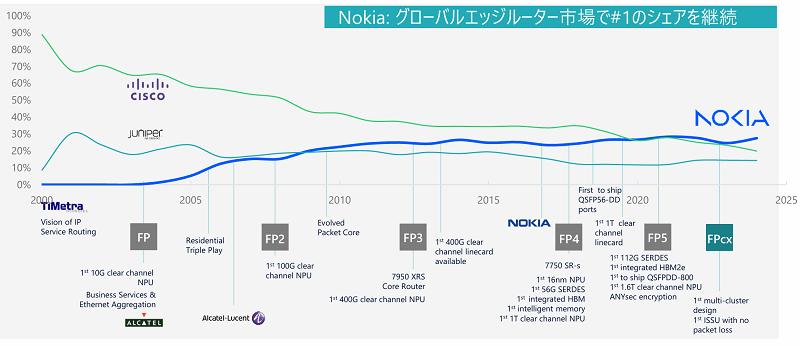 キャリア寄りの話となるが、Nokia IPルータのグローバルマーケットにおける実績は伸びており、アメリカ市場でもシェアトップになっている。「絶対に落とせない」という設計思想(冗長化技術や障害検知プロトコルなど)が求められるキャリア市場で培われたこうした技術は、ITのユーティリティ化による設置環境の変化に対応する様々なモデルの信頼性にも繋がっている。