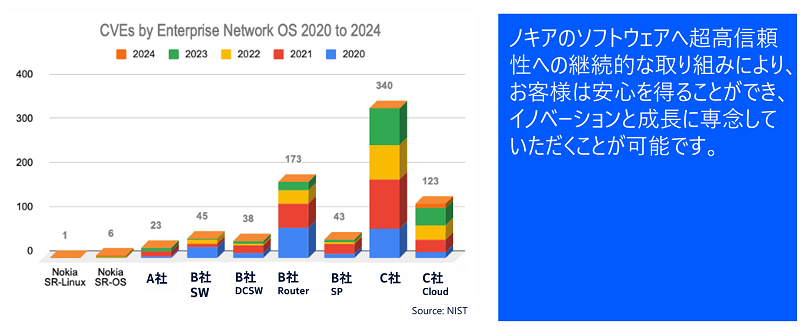 自社製チップは、CVE管理における信頼性の高さにも繋がる。ノキアは、ルータOSでクラス最高のソフトウェア品質を実現している。