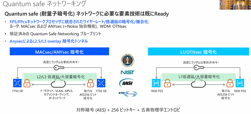 ノキアは、複数ネットワークレイヤでの量子暗号化も提案している。L1暗号化は物理層に近い部分で圧倒的な低遅延・高帯域を実現するが、量子暗号(特にQKD:量子鍵配送)や耐量子計算機暗号(PQC)を導入する際、L1(OTNsec)だけでなく Anysec(L2.5/L3)を併用する多層防御(Defense in Depth)は、セキュリティと柔軟性の両面から非常に有効な戦略となる。
