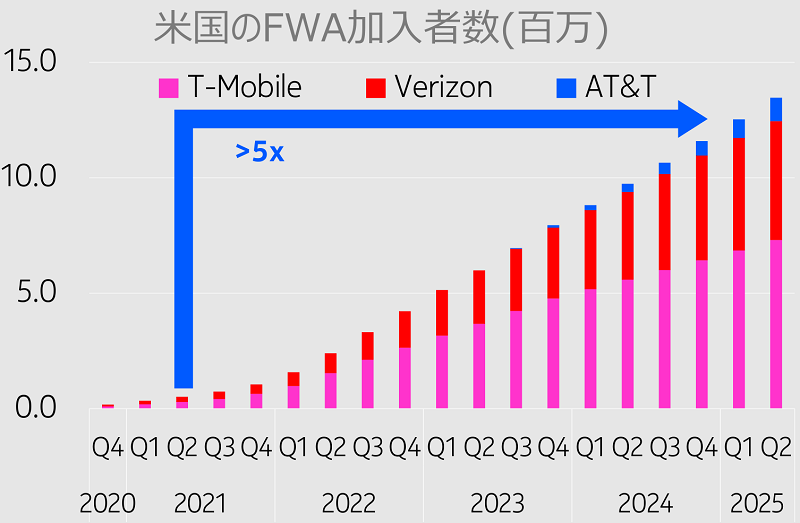 米国におけるFWA加入者の急成長。現在のFWA加入者は1,400万。FWAサービスにより米国の通信事業者は、50億ドル以上の収益。