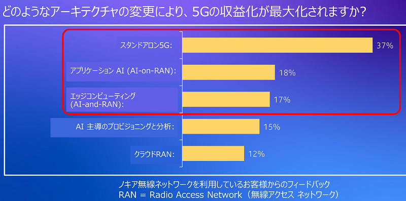 5Gの収益化を進める上で、5G SAへのアーキテクチャ移行とAI-RANが必要というのが、ノキアと顧客の見解だという。