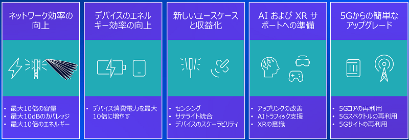 将来の6Gの商用化に向けて、ノキアは非常に高いターゲットを想定している。現在の5Gと比較し、ネットワークの効率化、カバレッジエリアの拡大、アップリンクのデータ量の増加をめざし、基地局やデバイスの電力効率の向上も重視している。また、AI やXRのユースケースを想定した接続を最適化するデザインや、統合されたセンシング、衛星との接続、デバイスの拡張性もある。