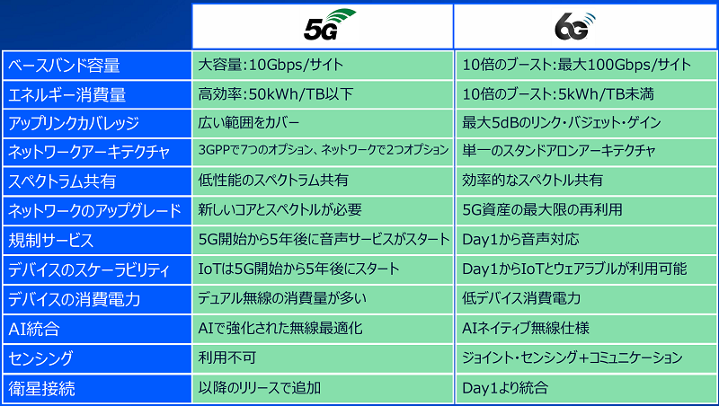 6G標準化は、高い目標から始動する。例えば、基地局のピークのデータレートは100Gbps、電力消費量は5kWh/TB未満と、5G比で10倍の改善となる。スペクトルのリファーミングも効率化される。そして新しいサービスやデバイスのスケーラビティに関しては、音声やIoT・ウェアラブルが初日から使えることを目標としている。5Gの強化で使われているAIも、6Gでは完全に無線に組み込む想定となる。ホルマー氏は「衛星やセンシングなども含め、これらの実現には新しいイノベーションが必要になる」と説明している。