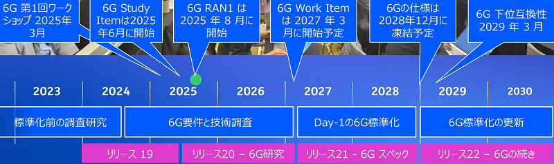 3GPP標準化における、6Gスケジュール。6Gの商用展開のタイミングは、2029年末から2030年を見込んでいる。