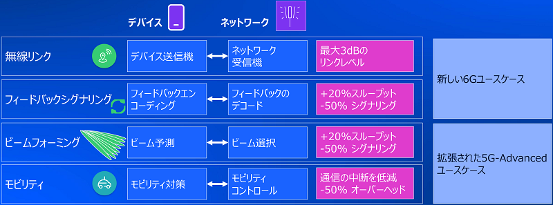 また、5G-AdvancedにおけるAI活用として、マルチユーザMIMOのビームフォーミング効率化や、モビリティの通信断を低減することで信頼性が向上できることも示された。