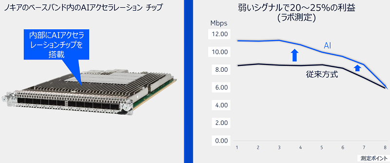 ノキアは、5G-AdvancedのAI活用の方向性を先取りして、すでに5Gハードウェア段階で実装を始めている。AIアクセラレーションチップを最新のベースバンド製品に搭載することで、無線のパフォーマンス向上を実現しており、ホルマー氏は「ラボでアップリンク受信を測定したところ、受信機のチャネルの推定をAIベースのチャネル推定のレシーバに交換することで、データレートのパフォーマンスが向上するというデータも出ている。ノキアでは、こうした5GハードウェアにおけるAIを活用した無線の改善を、6Gでさらに進めていくことになる」と説明している。